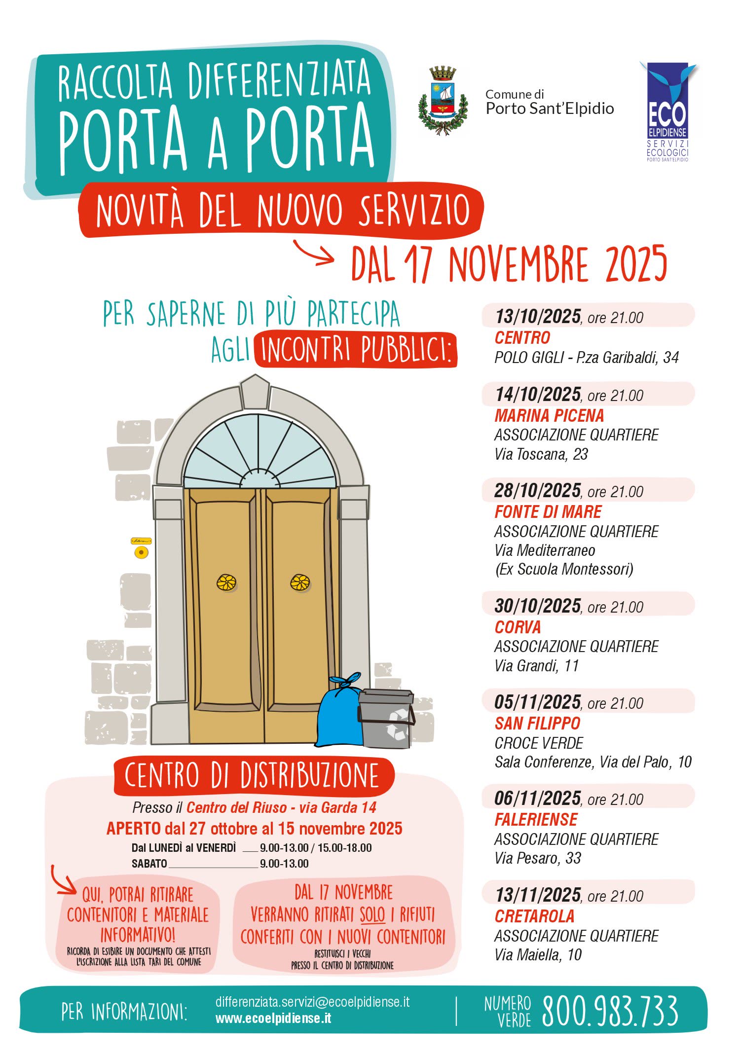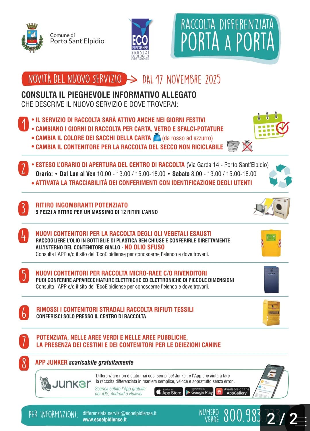 Si informa la cittadinanza che dal 17 novembre 2025 verrà attivato il nuovo servizio di raccolta differenziata dei rifiuti “porta a porta”, integrato e migliorato rispetto all’attuale, per rispondere meglio alle esigenze e alle aspettative dei cittadini dell’intero territorio comunale.